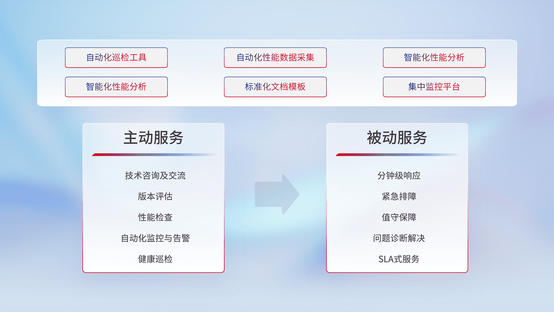 智能化工具和标准化文档,,保障服务质量,,提供主动服务(包含技术咨询、、、版本评估、、、性能检查、、自动化监控与告警、、、、健康巡检)和被动服务包含(分钟级响应、、、紧急排障、、、值守保障、、、、问题诊断解决、、、、SLA服务)。。。。